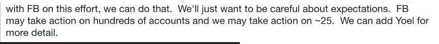 avec FB sur cet effort, nous pouvons le faire. Nous devrons juste faire attention aux attentes. FB peut prendre des mesures sur des centaines de comptes et nous pouvons prendre des mesures sur environ 25. Nous pouvons ajouter Yoel pour plus de détails.