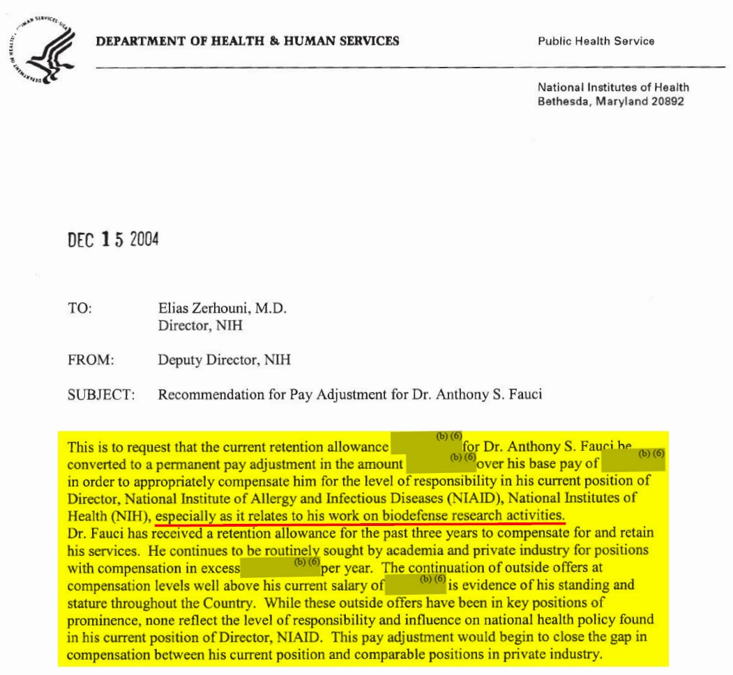 OBJET : Recommandation d’ajustement salarial pour le Dr. Anthony S. FauciCeci a pour object de formuler la requête que l’actuelle prime d’Anthony S. Fauci soit convertie en une adaptation permanente de son salaire de base de […] afin de le rémunérer de manière appropriée pour le niveau de responsabilité de son poste actuel de directeur de l’Institut national des allergies et des maladies infectieuses (NIAID) des National Institutes of Health (NIH), en particulier en ce qui concerne son travail sur les activités de recherche dans le domaine de la biodéfense, en particulier en ce qui concerne ses activités de recherche en matière de biodéfense.