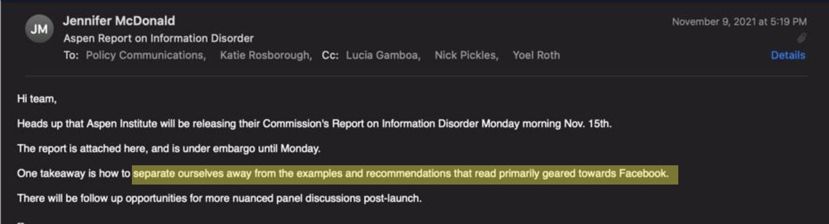 28. Renee DiResta, responsable de la recherche à l’EIP, s’est vantée d’avoir réussi, tout en comblant des « lacunes », à amener les « partenaires technologiques » Google, TikTok, Facebook et Twitter à prendre des mesures sur « 35 % des URL signalés » dans le cadre des politiques de « suppression, de réduction ou d’information ».