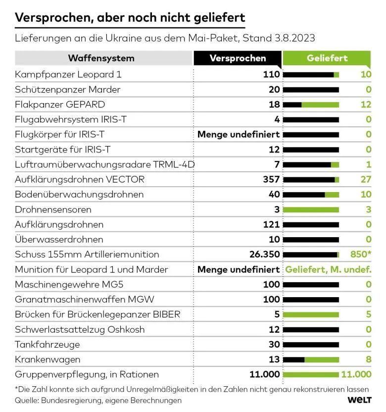 C’est ce que rapporte l’édition allemande de Die Welt ℹ️, citant ses calculs. Berlin s’est donc engagé à fournir des armes en mai dans le cadre de la nouvelle dotation dès que possible, mais l’Ukraine n’en a reçu que très peu jusqu’à présent.